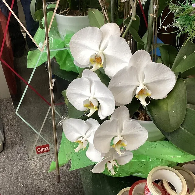2年前にいただいた蘭の花。鉢植えをずっと水やりしていましたら、なんと3回目が咲きました。3本の欄だったのですが、1本は死んでしまったのですが、二本きれいに花を咲かしてくれました。段の横の花はアークフラワースタジオさんが毎月持ってきてくれる花です。