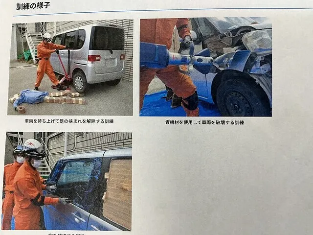 その間に本当にうちのお客様で僕の個人的な先輩が甲山で事故を起こし、車が炎上、4時間にわたって道路も封鎖され、車はシートも全部なくなってただの鉄骨みたいになっていたことがありました。ただ、その先輩は救急隊員に助けられ、骨折は何箇所かしていましたが、命に別状はなく、今ピンピン元気に仕事されています。あの訓練が役に立ったのかどうか分かりませんが、やはり普段からの訓練で動きは変わると言うことを聞いていますし、どこか僕たちのわからないところで、見えない命が助かっているのだと考えたら、ほんとにこんな廃車車両を貸すだけで訓練してもらえるなんてありがたい話です。